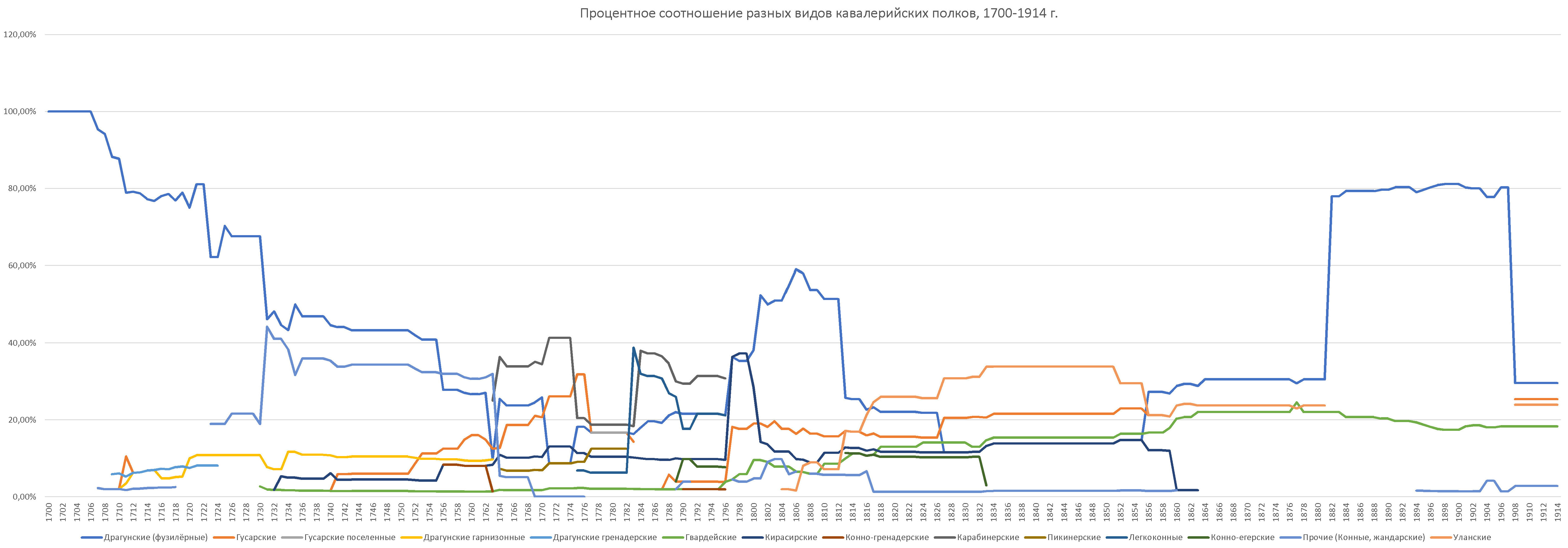 Процентное соотношение разных видов кавалерийских полков русской армии