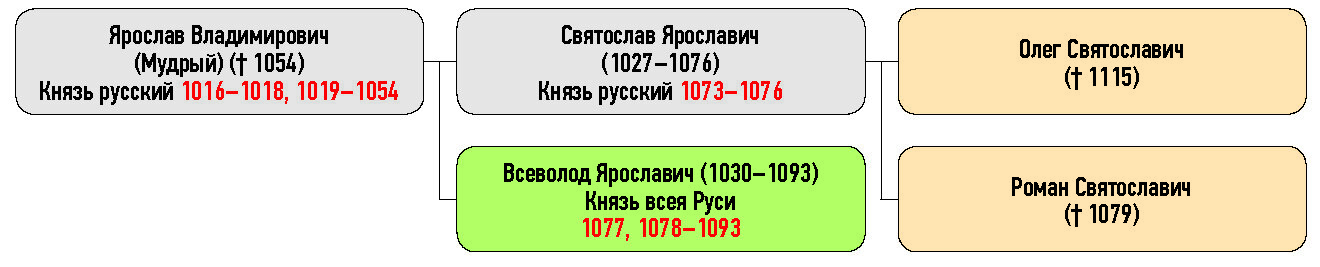 Ярослав Владимирович (Мудрый) († 1054), Роман Святославич († 1079), Святослав Ярославич (1027–1076), Всеволод Ярославич (1030–1093) Князь всея Руси, Борис, Олег Святославич († 1115)