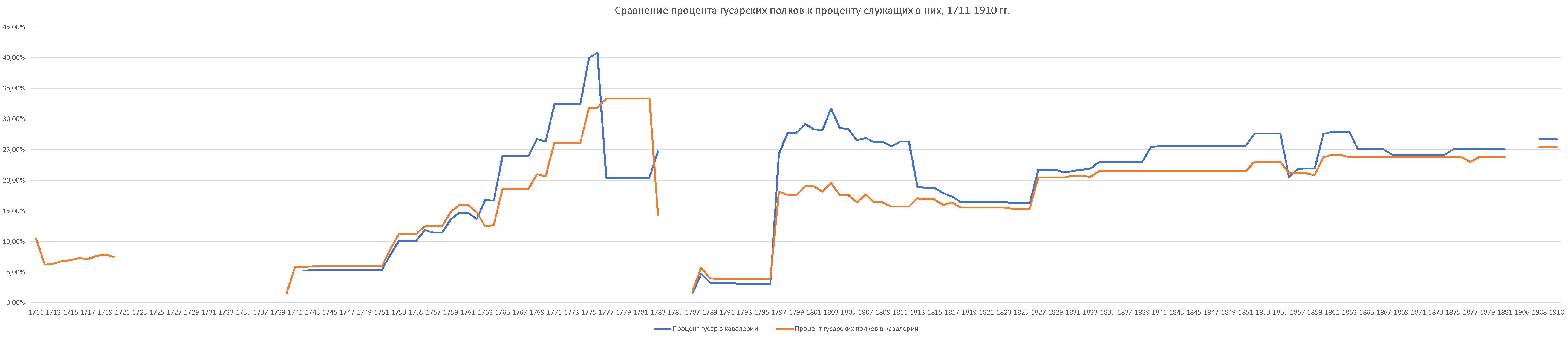 Сравнение процента гусарских полков к проценту служащих в них русской армии