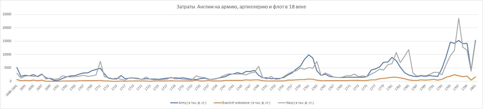 Затраты Англии на армию, артиллерию и флот в 18 веке