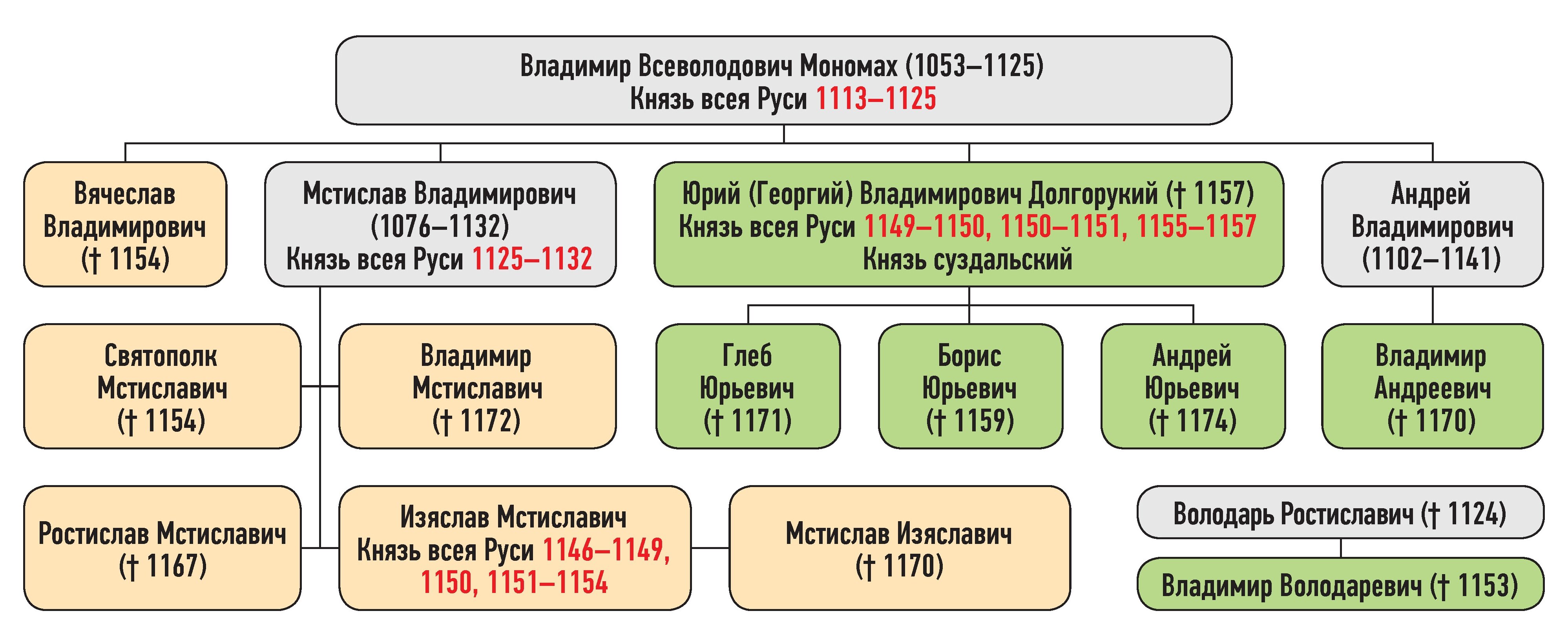 Генеалогическая схема к продолжению усобицы Изяслава Мстиславича и Юрия Владимировича зимой 1150 г