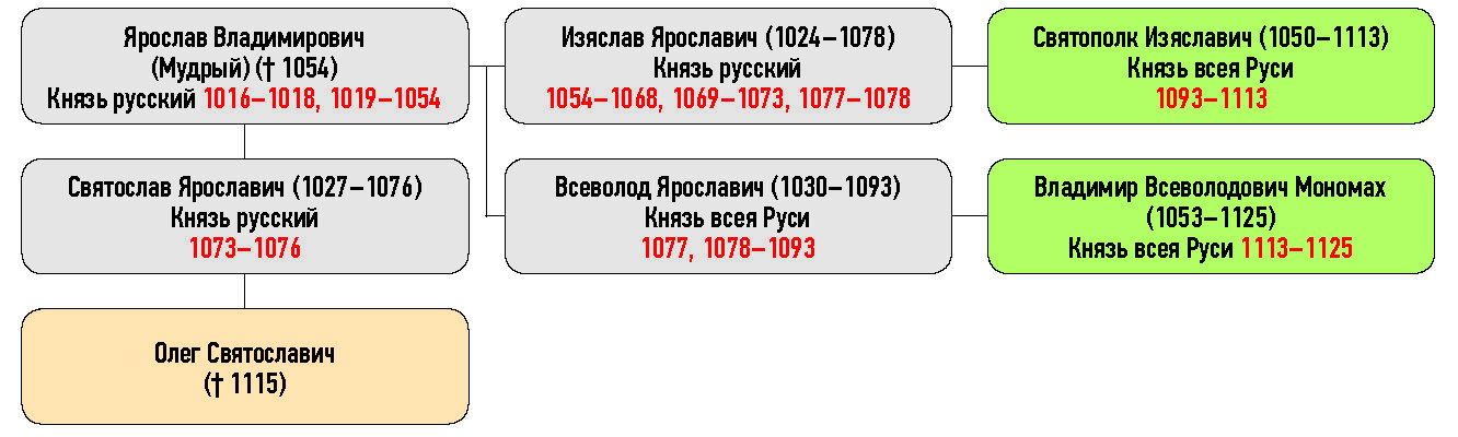 Ярослав Владимирович (Мудрый) († 1054), Всеволод Ярославич (1030–1093) Князь всея Руси, Изяслав Ярославич (1024–1078) Князь русский, Святослав Ярославич (1027–1076) Князь русский, Святополк Изяславич (1050–1113) Князь всея Руси, Владимир Всеволодович Мономах (1053–1125), Олег Святославич († 1115)