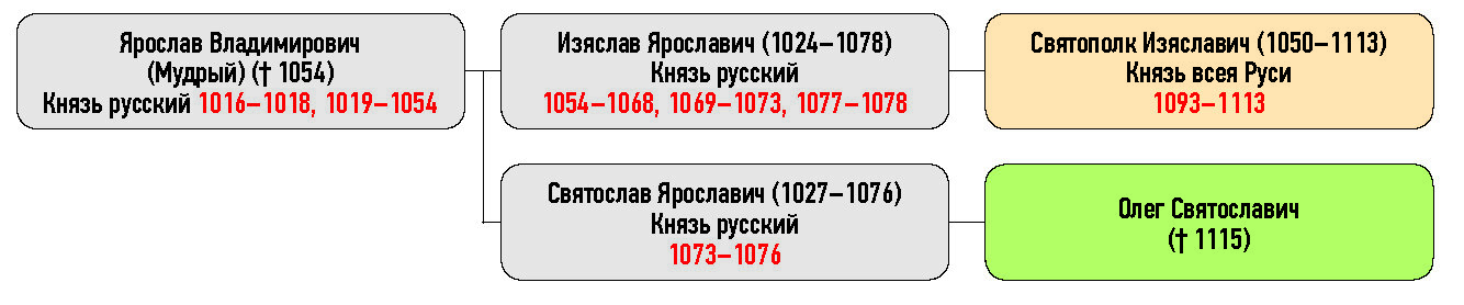 Ярослав Владимирович (Мудрый) († 1054), Изяслав Ярославич (1024–1078) Князь русский, Святослав Ярославич (1027–1076) Князь русский, Святополк Изяславич (1050–1113) Князь всея Руси, Олег Святославич († 1115)