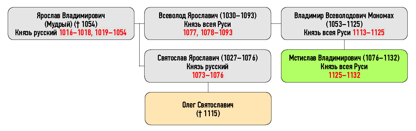 Ярослав Владимирович (Мудрый) († 1054), Всеволод Ярославич (1030–1093) Князь всея Руси, Святослав Ярославич (1027–1076) Князь русский, Мстислав Владимирович (1076–1132) Князь всея Руси, Олег Святославич († 1115), Владимир Всеволодович Мономах (1053–1125)