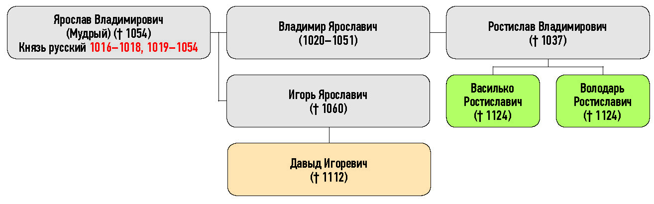 Ярослав Владимирович (Мудрый) († 1054), Владимир Ярославич (1020–1051), Ростислав Владимирович († 1037), Игорь Ярославич († 1060), Василько Ростиславич († 1124), Володарь Ростиславич († 1124), Давыд Игоревич († 1112)