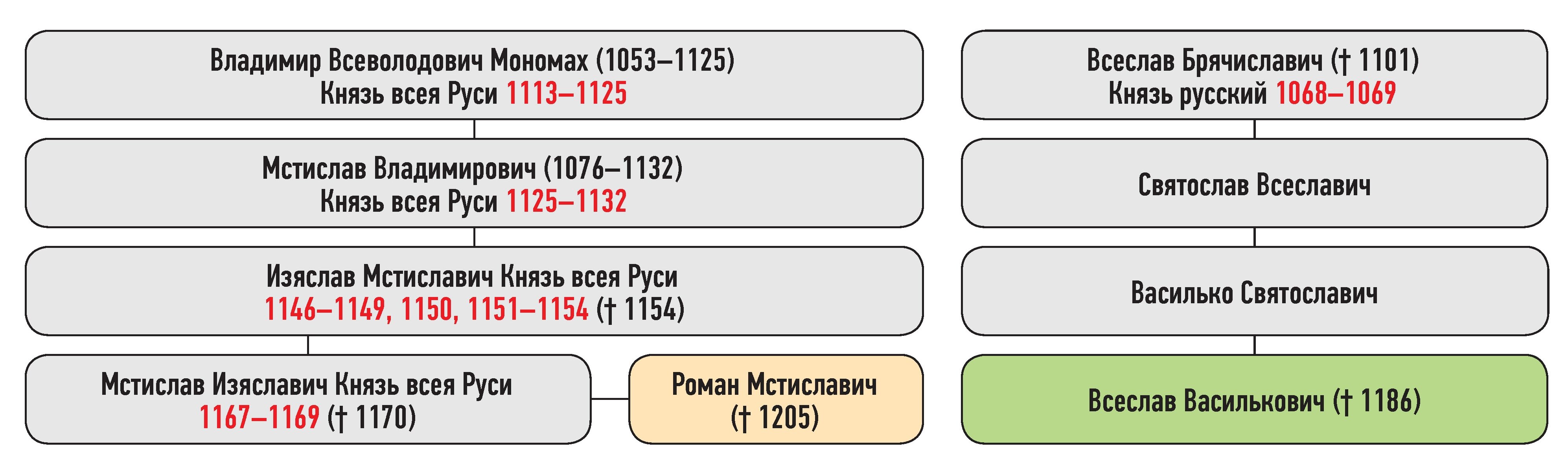 Генеалогическая схема к усобице Романа Мстиславича и Всеслава Васильковича в 1168 г.