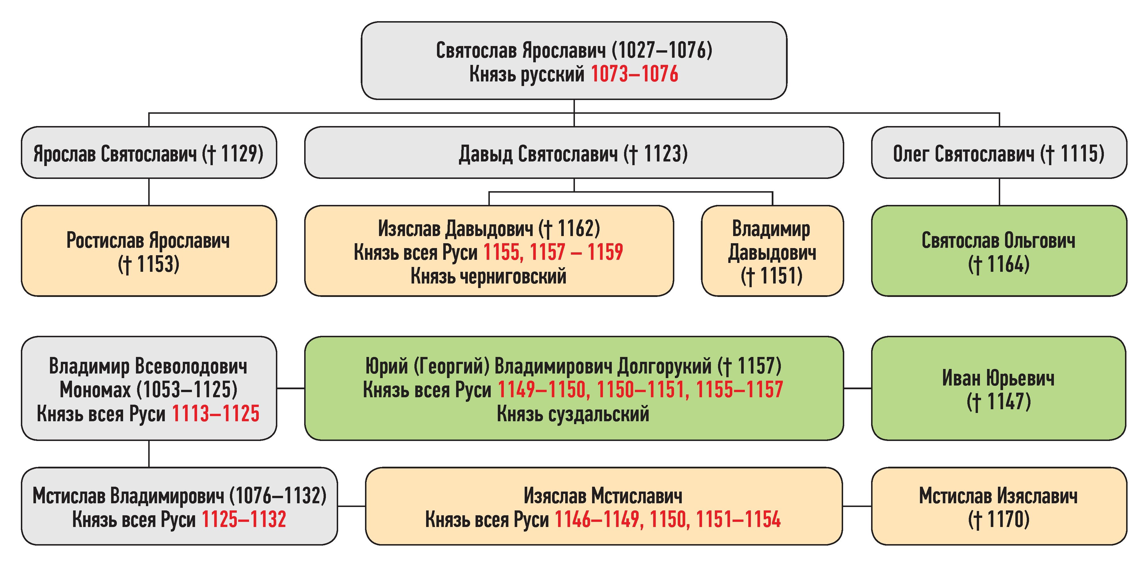 Мстислав Изяславич — сын Изяслава Мстиславича, Изяслав, Владимир Давыдовичи — сыновья Давыда Святославича, Ростислав Ярославич — внук Святослава Ярославича, Святослав Ольгович — сын Олега Святославича, Юрий Владимирович — сын Владимира Всеволодовича Мономаха, Иван Юрьевич — сын Юрия Владимировича