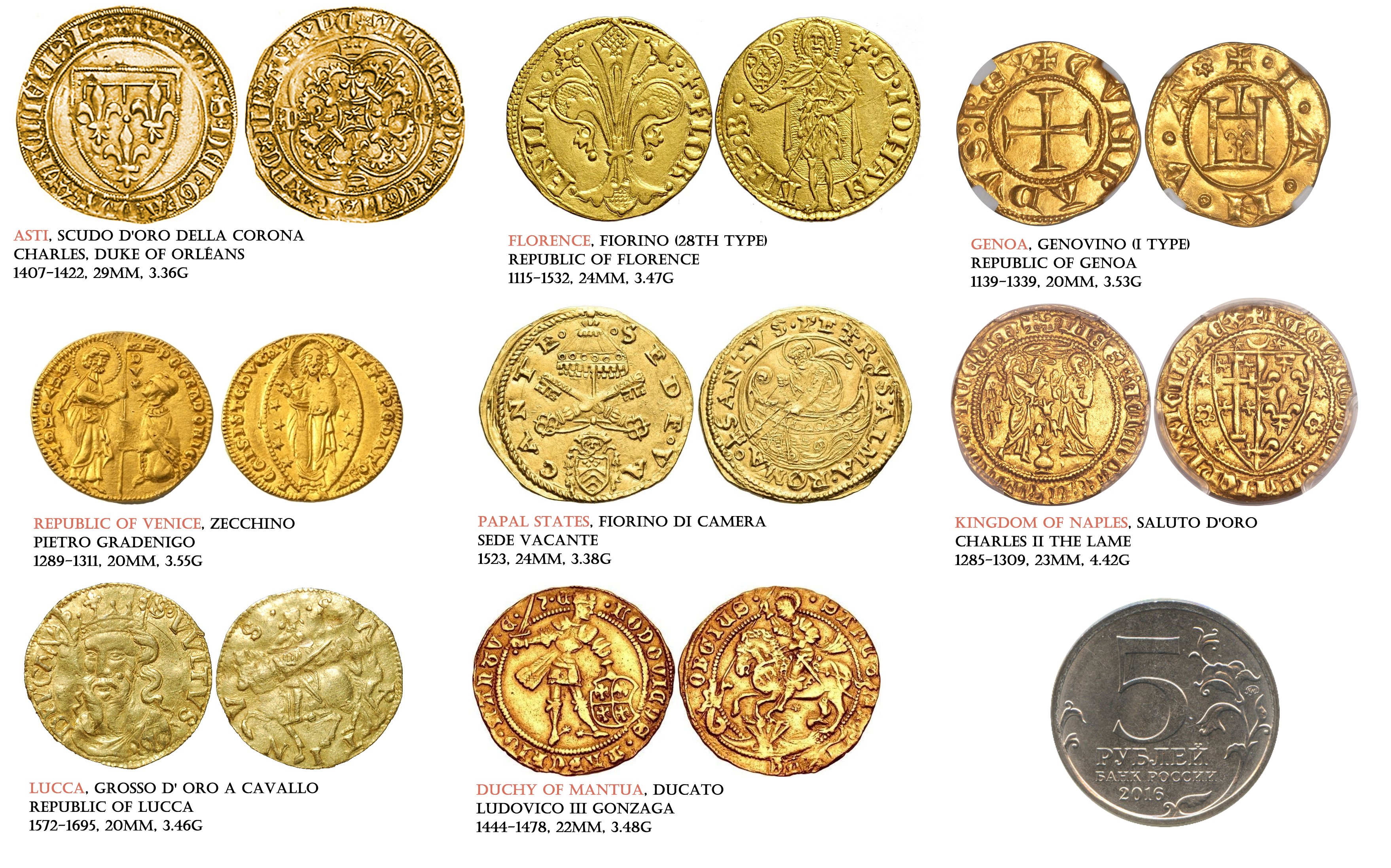 Коллекция стандартных итальянских торговых золотых монет - цехины, дукаты, скудо, дженовино и флорины.
