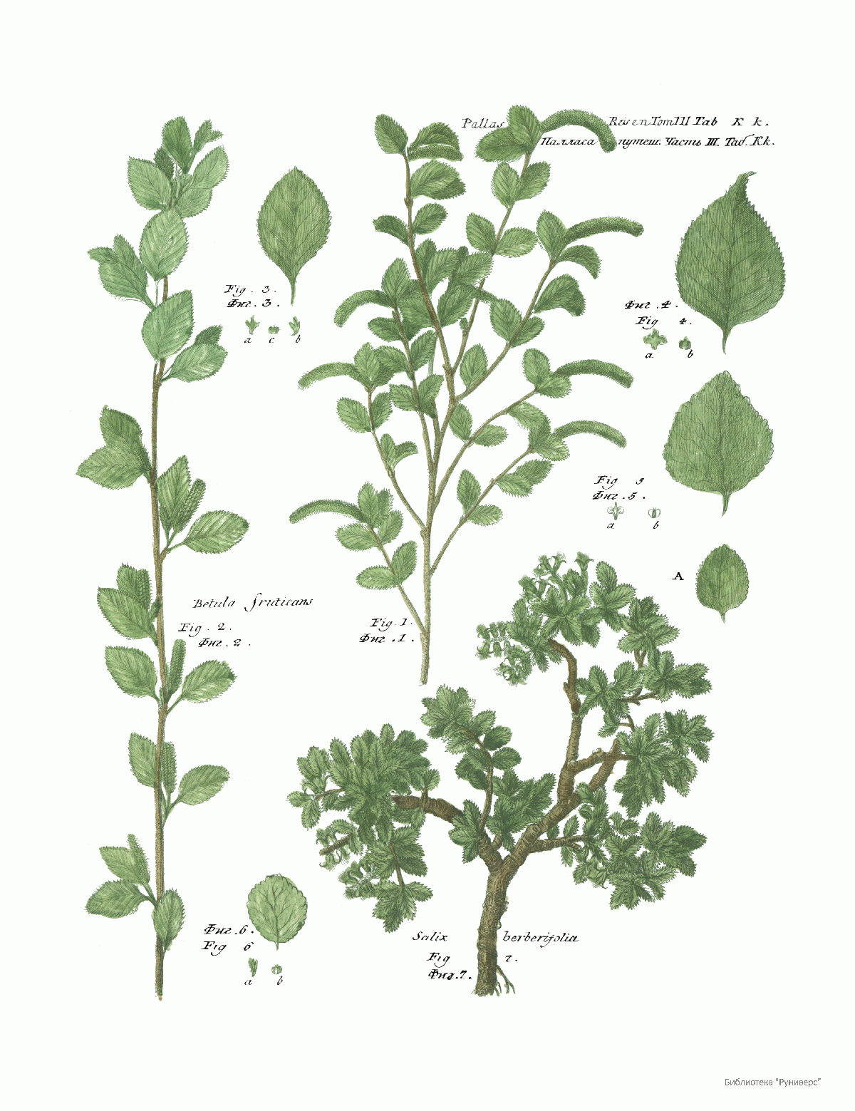 Том III. Таб.Kk. Betula fruticans. Salix berberijolia.