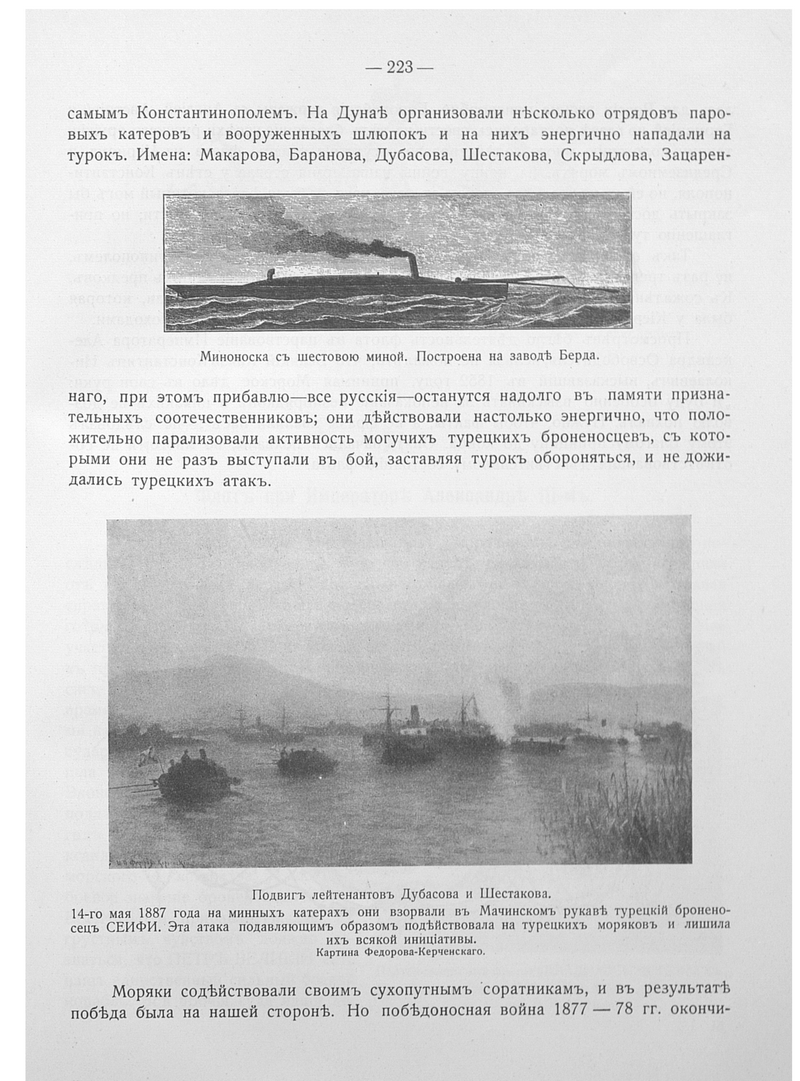 Подвиг лейтенанта Дубасова и Шестакова. 14 мая 1887 года на минных катерах они взорвали в Мачинском рукаве турецкий броненосец СЕИФИ.