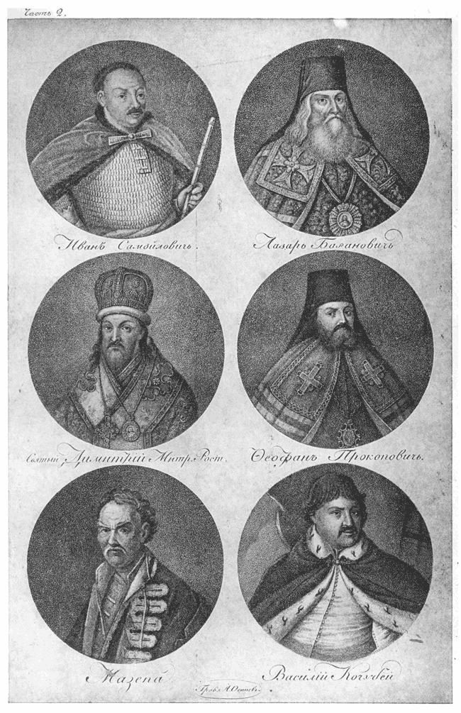 Портреты: Иван Самойлов, Лазарь Баранович, Святой Димитрий Митрополит Ростовский, Феофан Прокопович, Мазепа, Василий Кочубей.