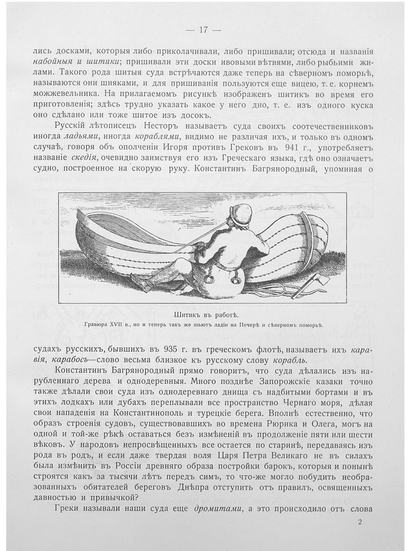 Шитик в работе. Гравюра XVII в., но и теперь так же шьют ладьи на Печере и северном поморье.