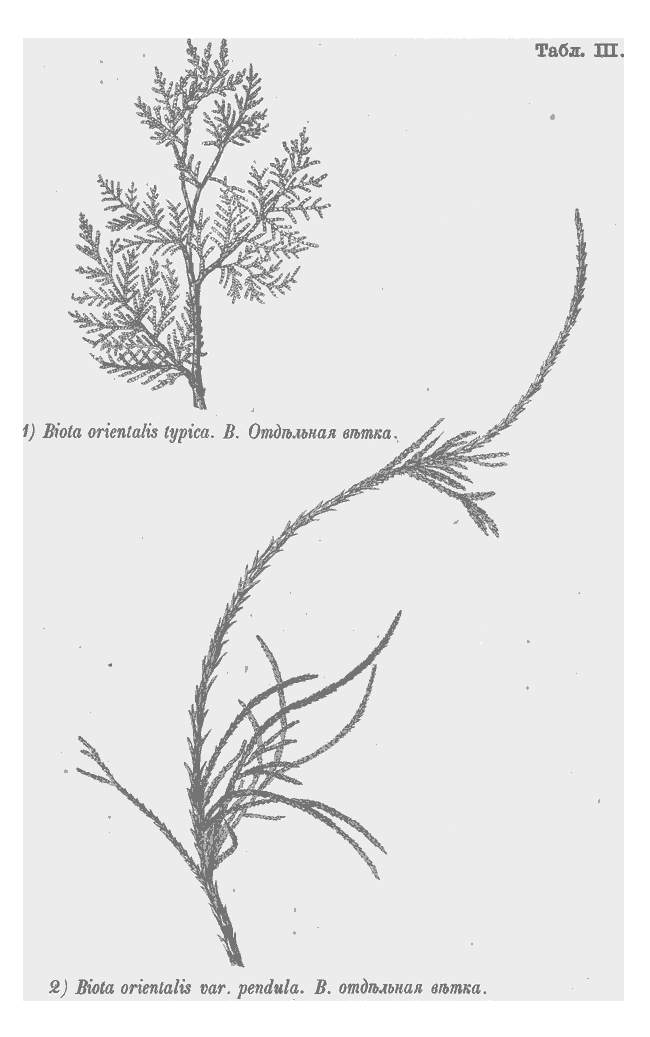 1) Biota orientalis typica. В.отдельная ветка. 2) Biota orientalis var.pendula s.filiformis. В.отдельная ветка