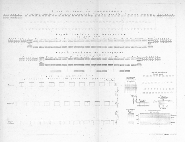 Чертеж строя легиона римской армии в разные времена в походном порядке.