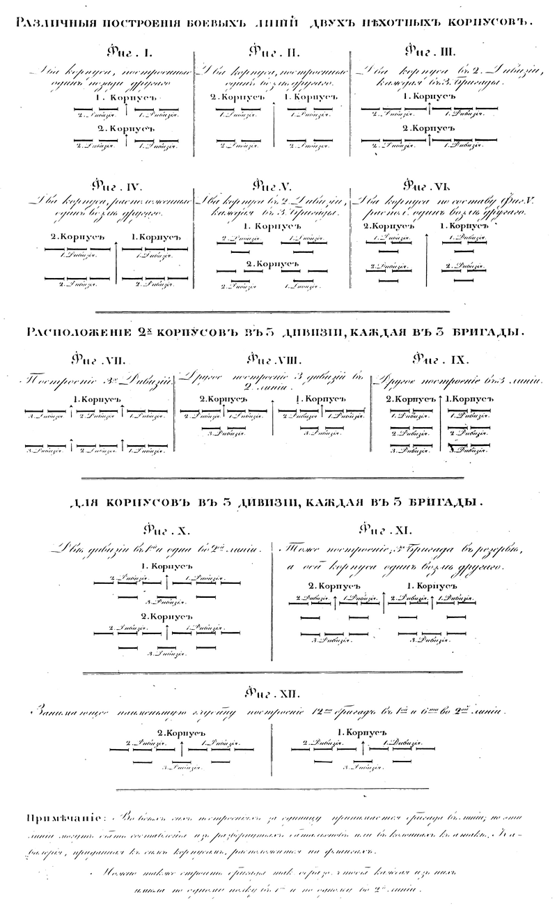 Различные построения боевых линий двух пехотных корпусов. Расположение 2-х корпусов в 3 дивизии, каждая в 3 бригады
