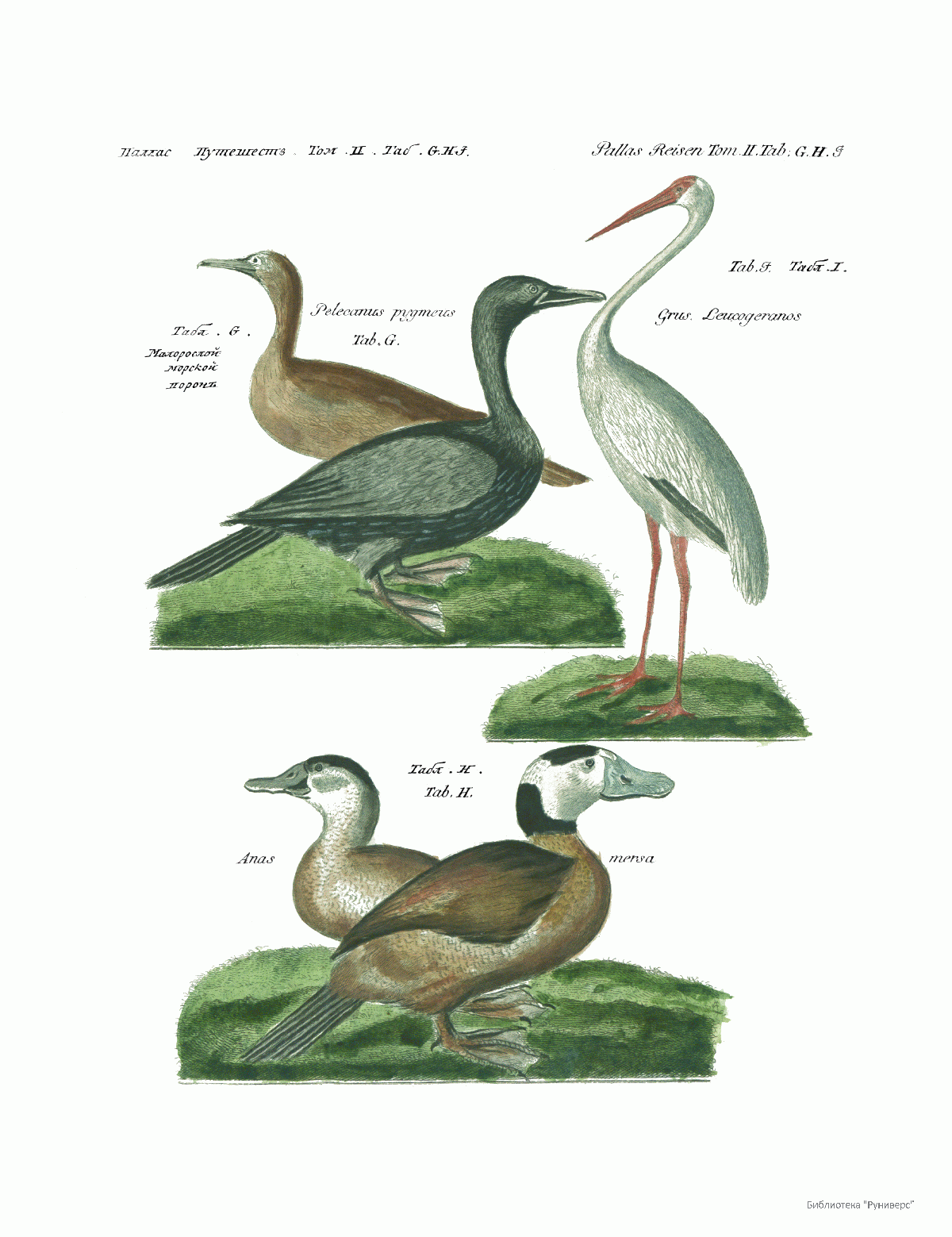 Том II. Таб.G. Малорослый морской ворон. Таб.H. Anas mersa. Таб.J. Grus. Leucogeranos.