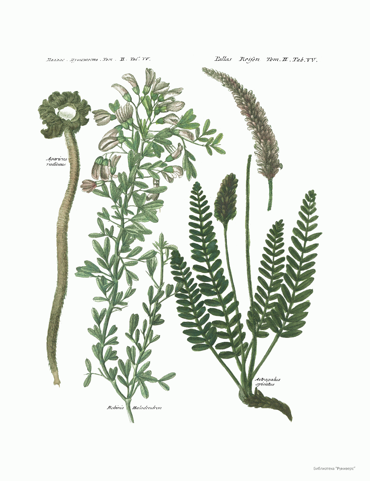 Том II. Таб.W. Robinia Halodendron. Astragatus spicatus.