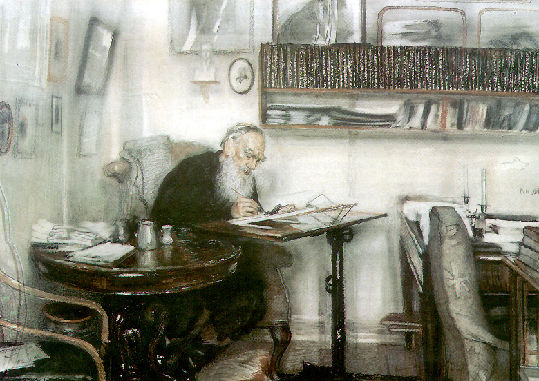 Л. Н. Толстой в яснополянской библиотеке. В. Н. Мешков. 1910 год