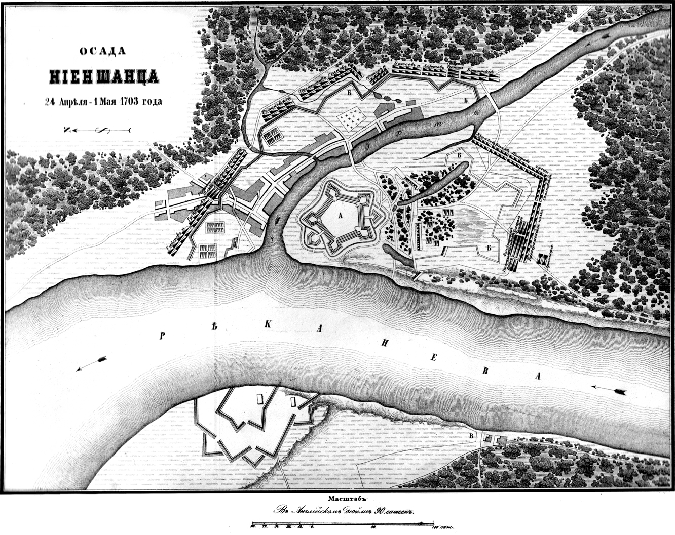 Адриан Схонебек по рисунку Питера Пикарта. План осады Ниеншанца 24 апреля — 1 мая 1703 г.