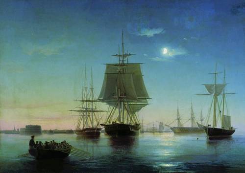 Кронштадтский рейд с кораблями вечером. Боголюбов А.П. 1855 год