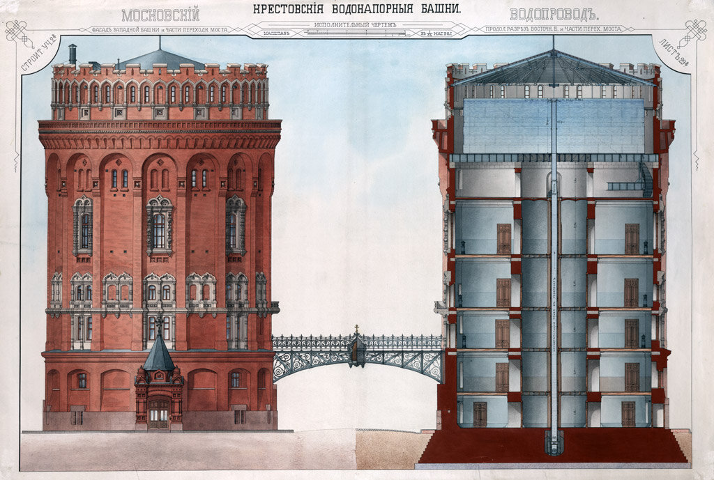 Архитектор - Максим Карлович Геппенер. В верхней части башен располагались большие резервуары для воды, а под ними - жилые и рабочие помещения.