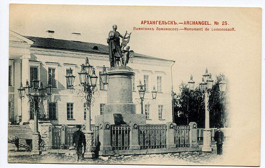 Представлен вид памятника в начале XX века. Открытка производства Шерер, Набгольц и Ко. Каталог открыток. Архангельск. №25. Памятник Ломоносову. Сфотографировано: До 1905 г.