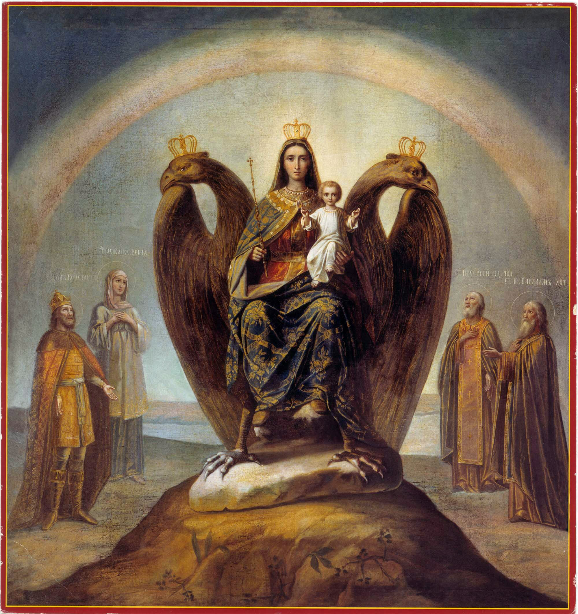 Картина написана в конце 19 века неизвестным художником и хранится в храме Преображения Господня села Верзилово Ступинского района Московской области. Этот храм до 1917 года принадлежал имению князей Шаховских, и, как предполагается, символическая картина была написана по их заказу в поддержку Царствующей династии Романовых. В начале ХХ века царь Николай II с царицей Александрой посещали имение Шаховских и в память о своем визите подарили храму лампаду с надписью-украшением выполненной эмалью: «В честь коронования Николая и Александры 1896 г.»