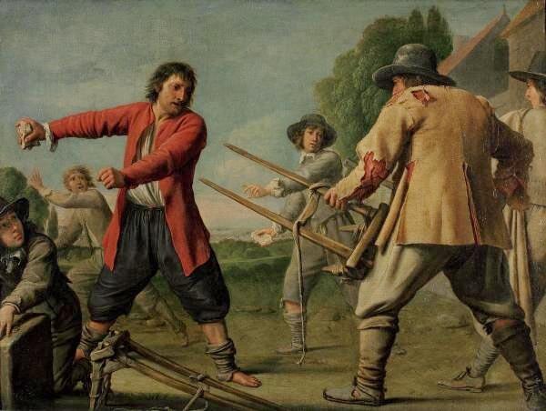 Произведение «Драка при расчете» приписывается анонимному Мастеру Процессий, представителю так называемого «реального жанра». При всей жизненной достоверности она не кажется эпизодом реального быта, в большей мере напоминая сцену из балаганного театра. Драка будто «танцуется» для публики, лохмотья и заплаты на одежде выглядят нарочито искусственно. ";s:4:"TYPE";s:4:"html";}