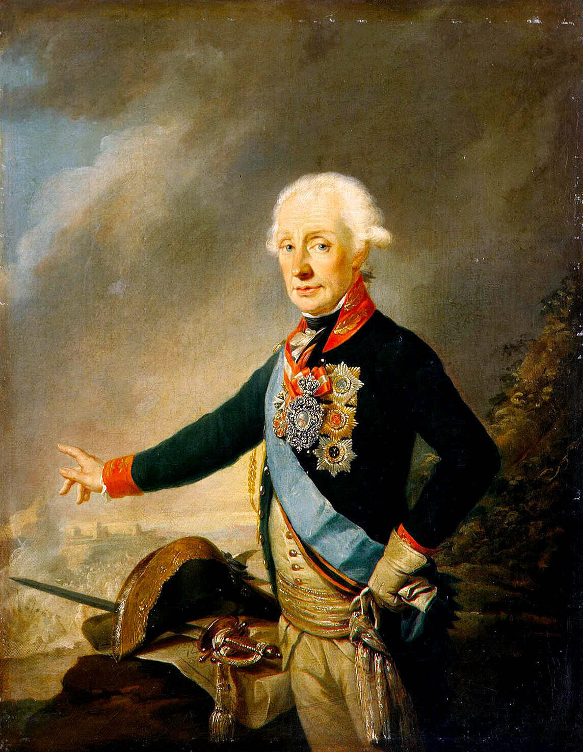 Суворов одет в мундир Преображенского полка времен Павла I. Через правое плечо поверх кафтана - лента ордена св. Андрея Первозванного, под кафтаном видна лента ордена св.Георгия. На шее - лента ордена св. Анны и св. Иосифа Иерусалимского. На груди на красно-белой ленте - портрет австрийского императора в бриллиантовой рамке и три орденские звезды.
