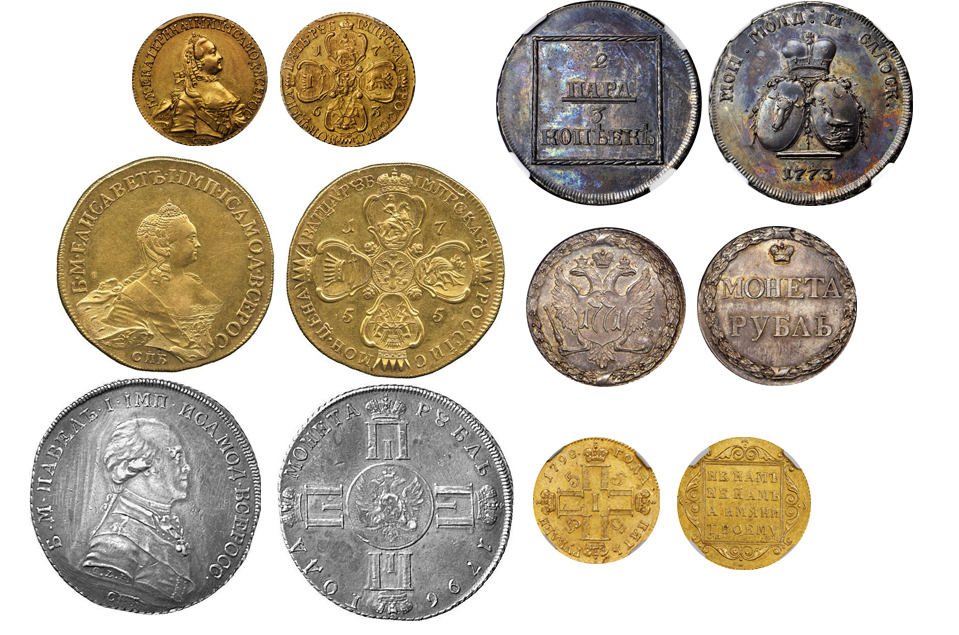 Екатерина II, 20 рублей, 1755 г., золото .917, 33,14 г, 37 мм, $2,474 млн., 2010 г., Baldwin’s of St. James Ltd.