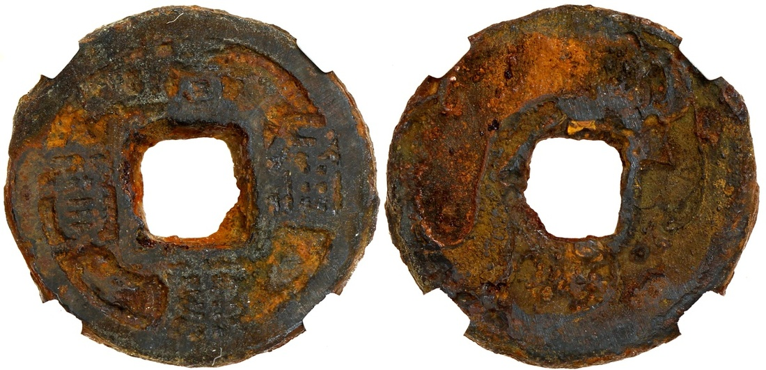 Цинь-цзун даже успел отлить аж две монеты! Это первая из них, железный вэнь jìng kāng tōng bǎo (靖康通寶), 23 мм, 5.9 гр, эстимейт $400