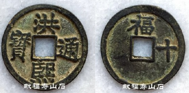 Hóngxī tōngbǎo (洪熙通寶) номиналом 10 вэнь, возможно, подделка. Масса 16 г, диаметр 40 мм