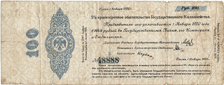 5% Краткосрочное обязательство Государственного Казначейства Российского правительства адмирала А.В. Колчака. 100 руб. Срок 1 января 1920 г. Аверс
