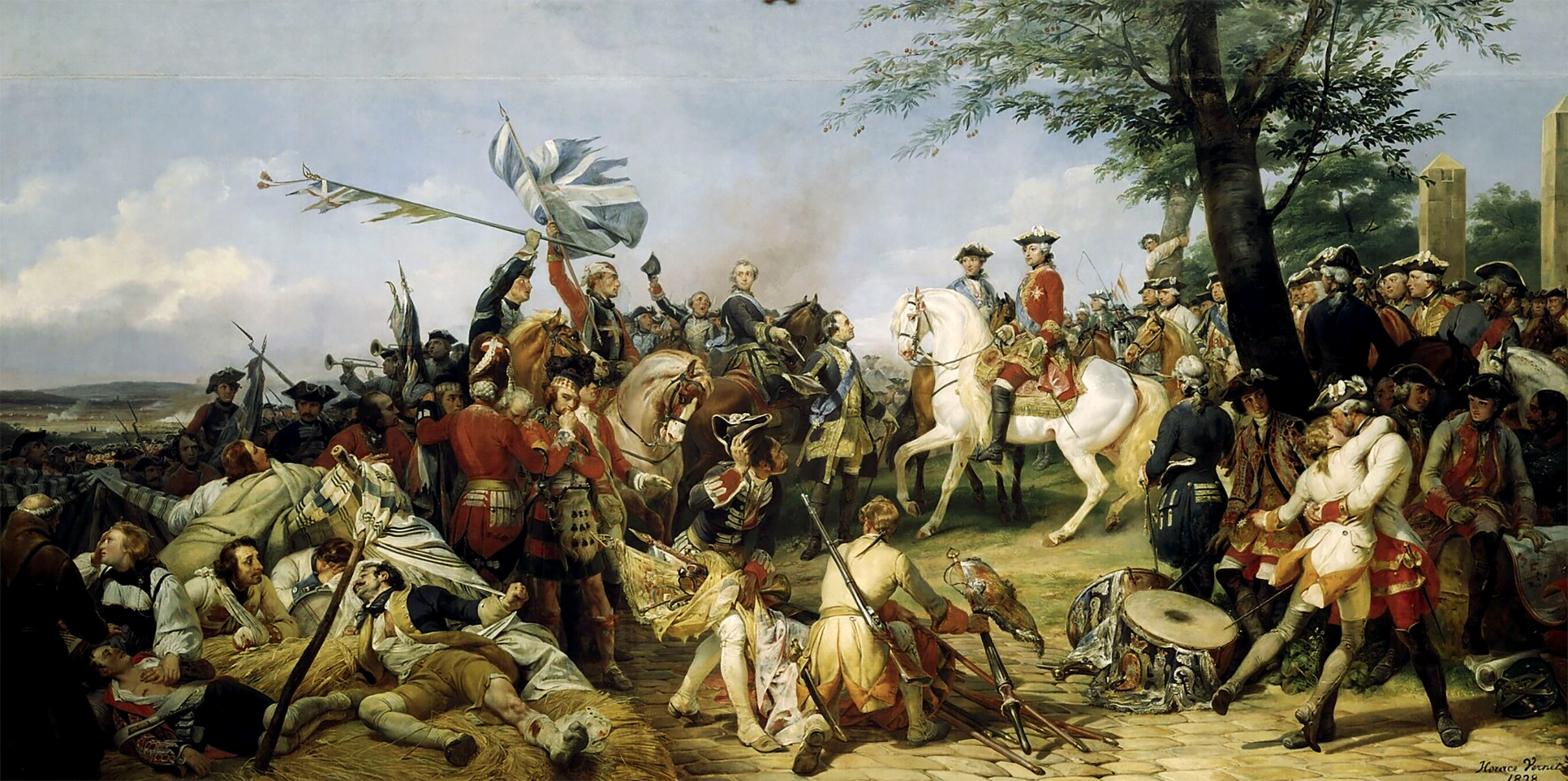 Командующий французской армией Мориц Саксонский преподносит Людовику XV и Дофину захваченное британское знамя после победы в битве при Фонтенуа