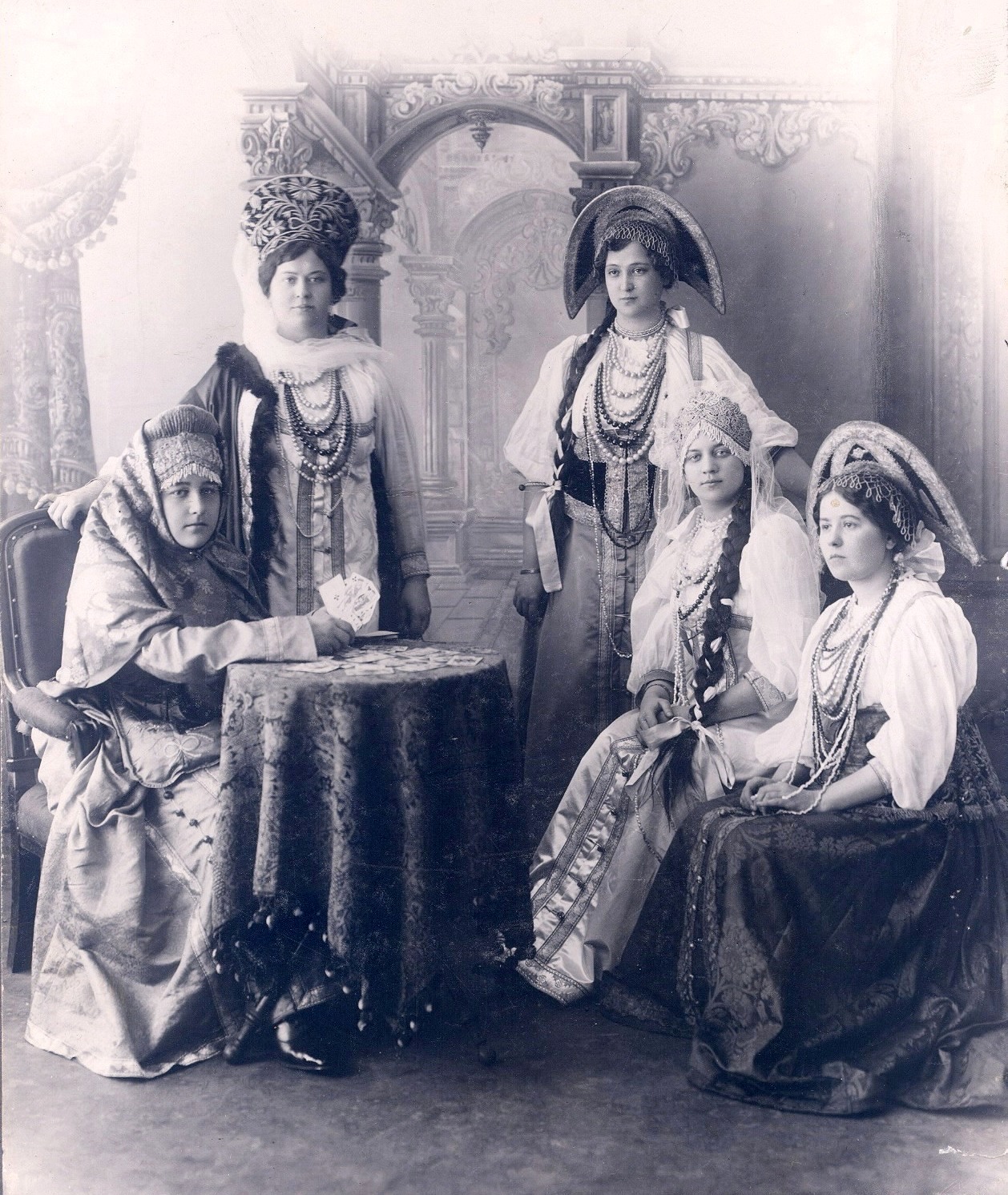 В русских костюмах. Справа стоит Елизавета Ивановна Гундобина, слева – ее сводная сестра Надежда Ивановна.Архив М.А. Казанковой.