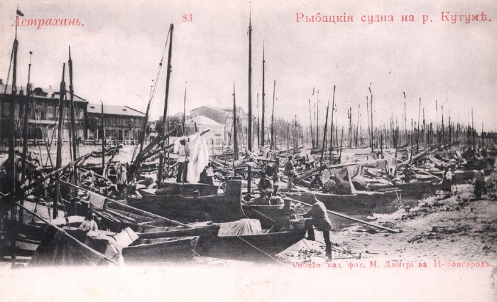Рыбацкие лодки на реке Кутуме. На переднем плане – рыбаки, занимающиеся оснасткой лодок. Астрахань