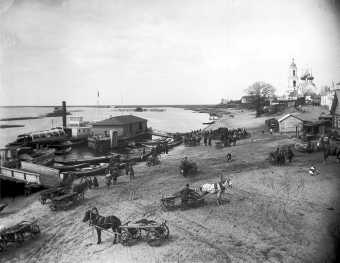 Пристань. Перевоз через реку Волгу. На заднем плане – Сергиевская церковь села Кононово.