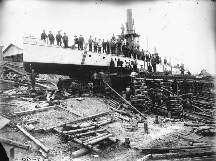Спуск канонерских лодок на воду на р. Шилке. Сормово, завод №112. Нижний Новгород.