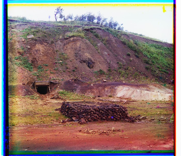 Пробная штольня. Перед ней сложен богатый бурый железняк.