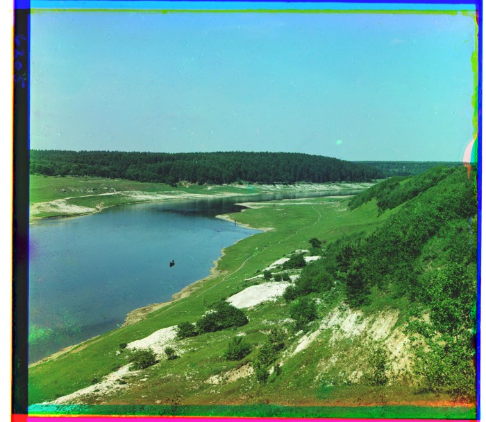[1910]. Река Волга у Зубцова. На другом берегу в лесу церквушка, на опушке – кладбище. [p] Не о таком ли пейзаже писал на чужбине поэт: [p] Тихое лето России, [p] Запахи пыльной травы, [p] Небо какой-то старинной [p] Темно-глухой синевы. [p][p] Фотография вошла в альбом «Российская Империя в цвете, 1909-1915, Владимирская и Ярославская губернии».