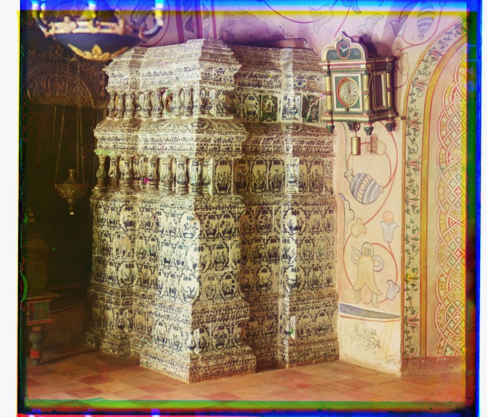 1911. Изразцовая печь в "Княжьих теремах" Ростовского Митрополичьего двора (XVIII) в Кремле.