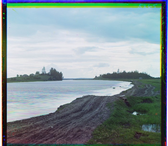 [1909]. Городецкий и Никитский погосты. Местоположение "Новгородская губерния" предположительно. Хрошо виден бечевник (бичевник) - дорога для буксировки судов и плотов.