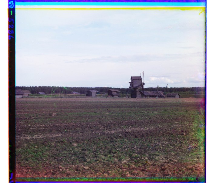 [1909]. Село Леушино. Правее мельницы, за лесом видны Троицкий собор и церковь при богадельне Леушинского монастыря.