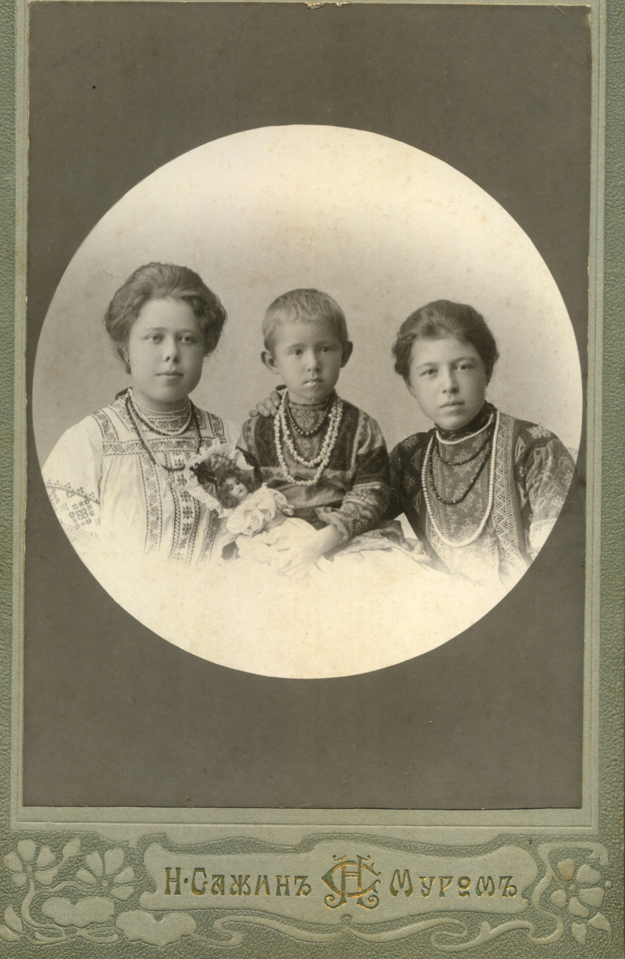 Фотоателье Н. Сажина, Муром. Групповой портрет девушек в народных костюмах. Слева направо: Мария Орлова, Софья Сокольская, Лиза Орлова. 1906-1907.
