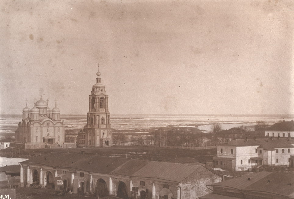 Мяздриков И.П. (1854-1931 гг.), Муром. Центральная часть города с кафедральным собором Рождества Богородицы, торговыми рядами, с видом на р. Оку. В левом нижнем углу фотографии логотип автора. Фото 1896 (?) г. 12х17