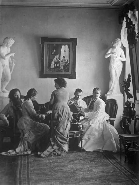 А.О. Карелин с учениками в студии. Спиной стоит Ольга Григорьевна Карелина (вторая жена). Автор: А.О. Карелин Место события: г. Н.Новгород Дата: к. ХIХ в.