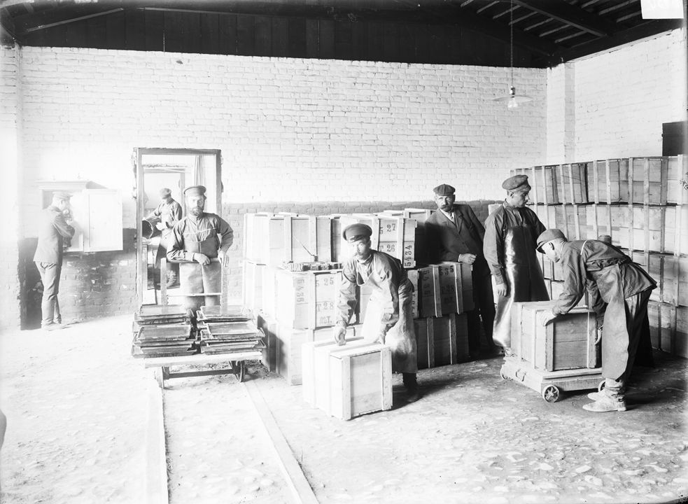 Внутренний вид казенного винного склада. Упаковка готовой продукции. Автор: М.П. Дмитриев Место события: г. Н.Новгород Дата: 1900 г.