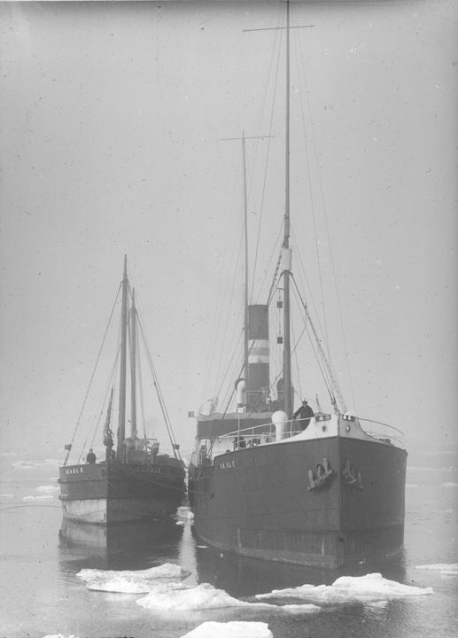 Пароход «Скулэ» и лихтер «Шальк». Общий вид. Автор: В.А. Зевеке Место события: Карское море Дата: 23 августа - 1 сентября 1914 г.