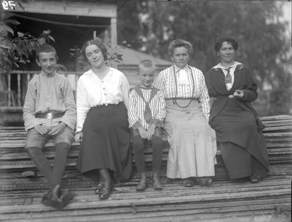 Групповой портрет. Три женщины, юноша и мальчик 5-6 лет. В саду. Автор: В.А. Зевеке Место события: г. Воткинск Дата: 1915-1916 гг.