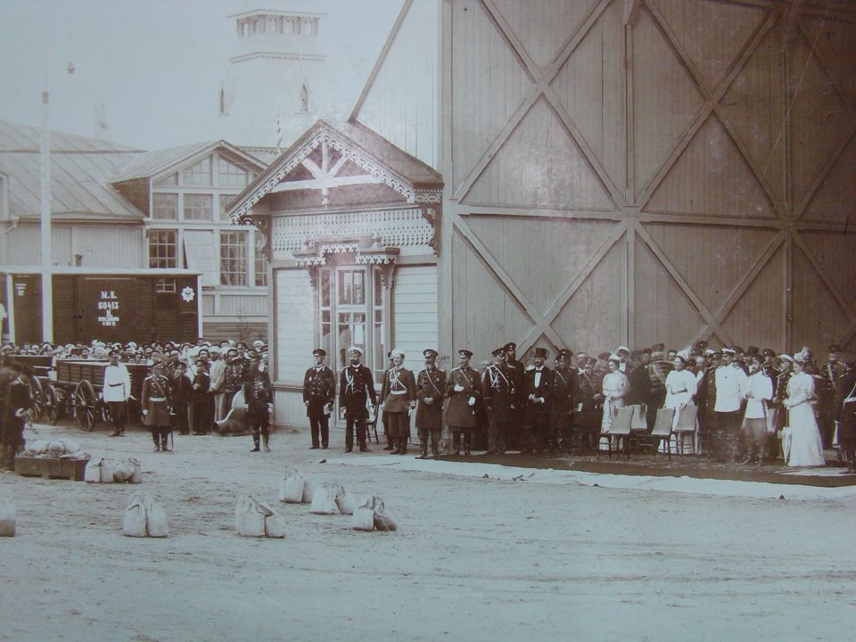 Визит Николая II на Всероссийскую промышленно-художественную выставку. Николай II со свитой при осмотре воздухоплавательного парка на выставке. Дата: 1896 г. Место съемки: г. Н.Новгород Автор: М.П. Дмитриев